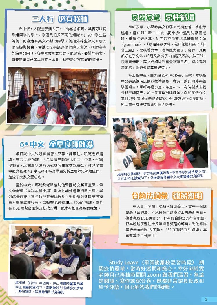 楊同學中一入學時,英文科不及格,但他願學受教,來到仁濟二中後,遇上英語良師悉心啟導,重新打好根基。